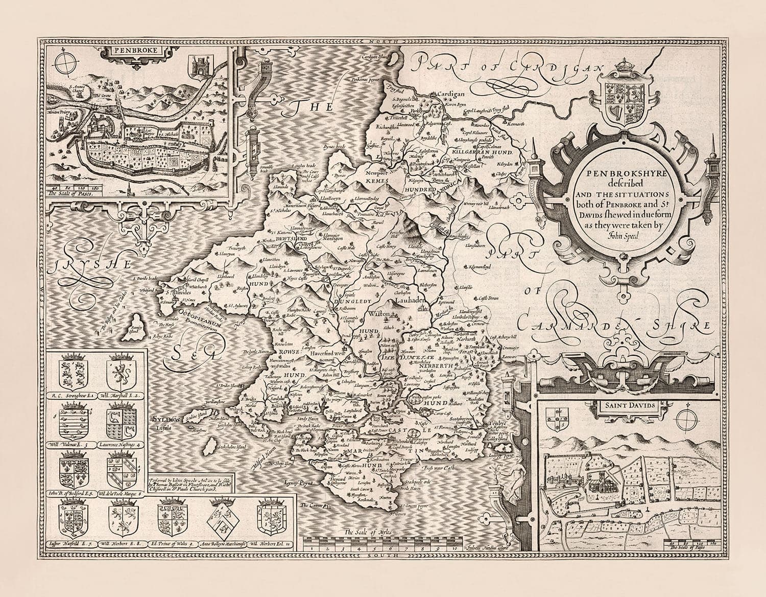 En la esquina superior izquierda hay un encantador y detallado grabado de Pembroke, la ciudad - y en la esquina inferior derecha, St Davids, la ciudad más pequeña del Reino Unido.