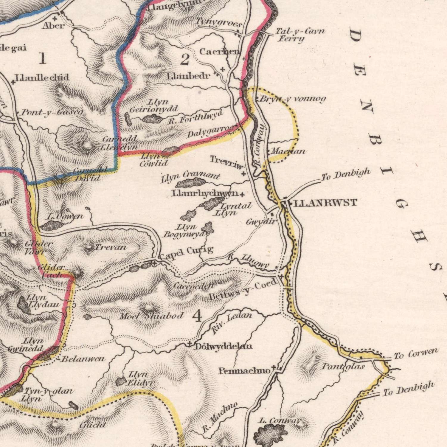 Along the north coast, the estuary of the Conwy and the bold promontory of Great Orme frame Llandudno and the fortified town of Conwy, their positions precisely fixed for the traveler and the antiquary alike. Westward, Bangor and Caernarfon anchor the Menai Strait, where the celebrated Menai Suspension Bridge, a marvel of early nineteenth-century engineering, is readily located as the essential crossing to Anglesey. The arterial route to Holyhead—Thomas Telford’s modern highway—threads cleanly across the county, while nascent rail corridors are signaled with the cartographer’s measured confidence. Shorelines, sands, and tidal reaches are carefully described so that harbors and river mouths read at a glance, binding sea-borne trade to inland routes.