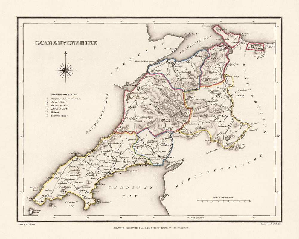 Carnarvonshire County, published in 1844 under the discerning editorship of Samuel Lewis and executed by the accomplished team of R. Creighton (draughtsman) and J. & C. Walker (engravers), distills a Welsh county in transition into a work of lucid authority. Hand-colored outlines cleanly separate administrative divisions, while fine hachures model the muscular rise of Eryri’s uplands against the softer littoral. The compass rose—tilting north toward the upper left—adds immediate navigational clarity, a Lewis hallmark that pairs elegance with utility. Roads, railroads, rivers, canals, and bridges are all crisply distinguished, ensuring that governance, commerce, and topography interlock on the page. As a county portrait at the dawn of industrial acceleration, the map captures Carnarvonshire’s coastal gateways and mountainous core with a balance of beauty and exactitude.