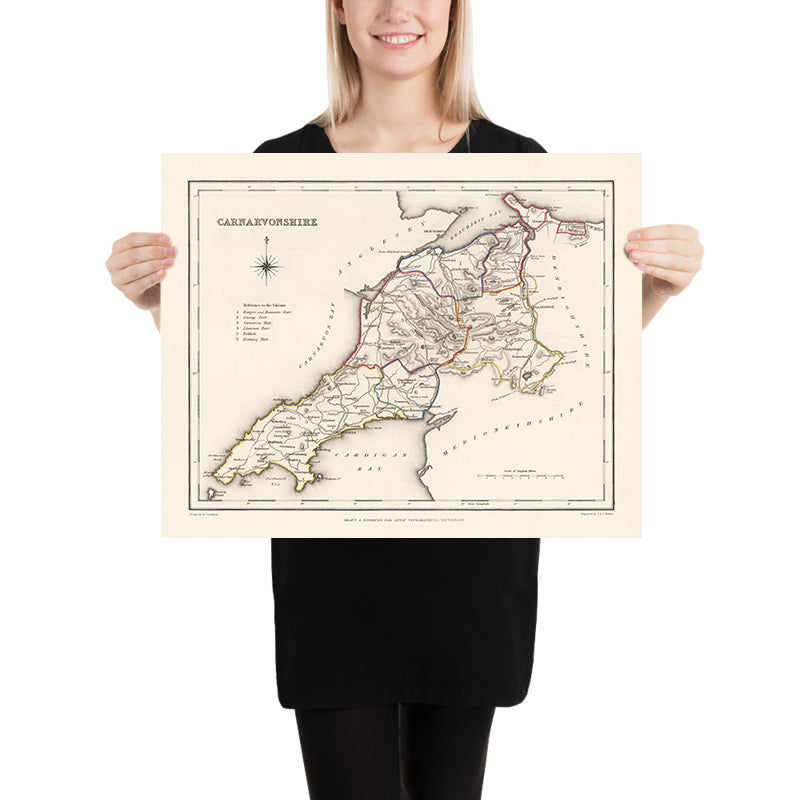 To the southwest, the Llŷn Peninsula stretches out, its low, windswept spine dotted with market towns and harbors, including Abersoch and Porthmadog, and further south the shore-line town of Harlech stands sentinel above Tremadog Bay. The map’s color-keyed administrative boundaries make immediate sense of the county’s internal order, while a reference table deciphers the Poor Law Unions that reorganized local governance in the 1830s and 1840s. These Unions—groupings of parishes around hubs such as Bangor, Caernarfon, Conway, Pwllheli, and Ffestiniog—reveal a county calibrated to social care as well as to trade. Canals and bridges are neatly annotated, linking quarries, farms, and ports into a single economy readable from coast to crest.