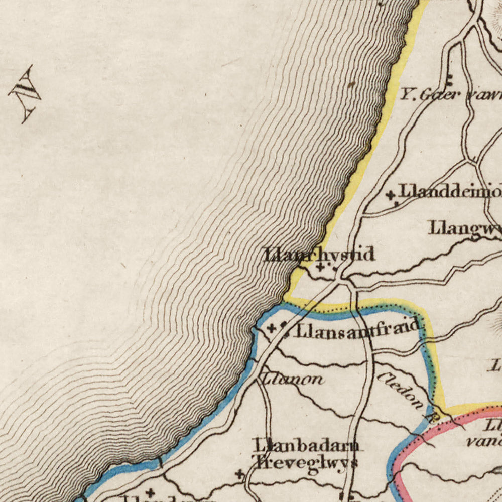 Samuel Lewis’s enterprise was to make the local knowable—comprehensive, readable, and dependable—and this map exemplifies that ethos. Creighton’s draughtsmanship supplies orderly geometry; the Walkers’ engraving translates it into crisp linework and elegant type, ensuring boundaries, roads, and hydrology remain distinct even where they crowd together. The hand-applied color heightens legibility without overwhelming the page, an editorial choice that reflects the cartographic standards of the 1840s. For historians of governance, students of Welsh topography, and anyone tracing family or place through time, the sheet preserves contemporaneous names and jurisdictions—evidence fixed before later reforms altered the county’s administrative landscape. It is both a geographic tool and a historical argument, gracefully made.