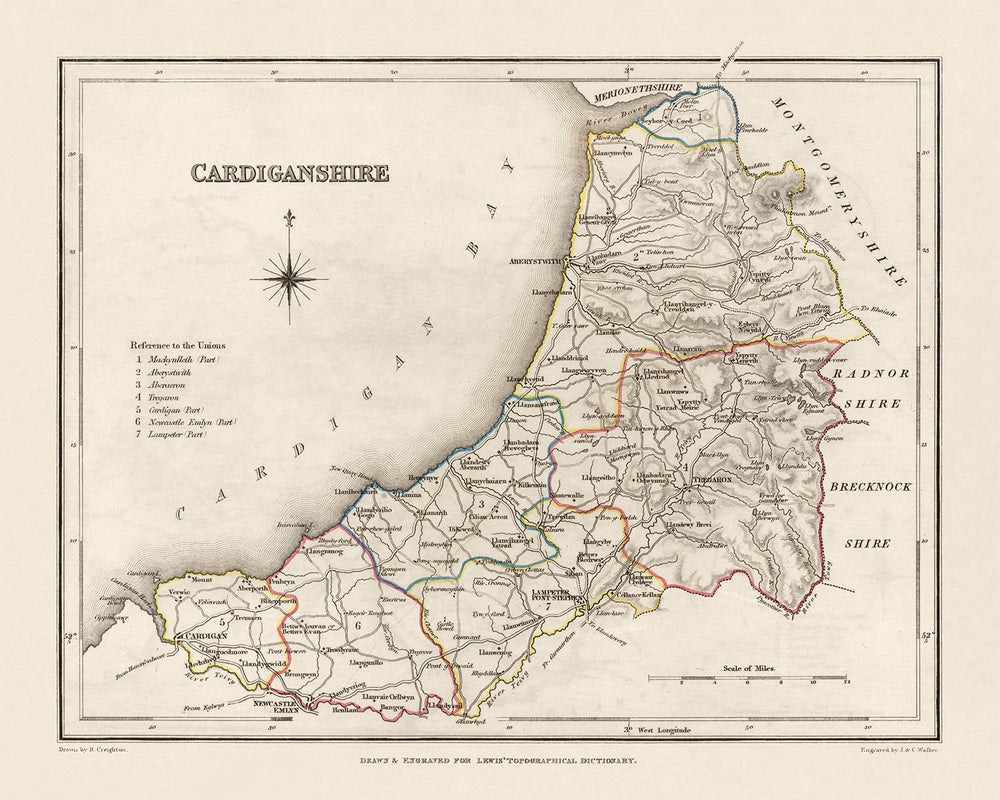 Cardiganshire County is the original title of this 1844 sheet, issued by Samuel Lewis & Co., drawn by R. Creighton and engraved by J. & C. Walker. It distills Lewis’s larger ambition: to record, with scholarly care, the local geography and history of Britain’s counties at a moment of accelerating change. Hand-colored outlines articulate the county’s administrative fabric, sharpened by crystalline lettering and the fine web of roads and waterways. Relief is expressed by precise hachures that give the uplands and valleys a tactile presence, while a handsome compass rose tips north toward the upper left, quietly guiding the eye. The result is a balanced composition—both practical guide and learned portrait—capturing Cardiganshire as it was known in the mid-nineteenth century.