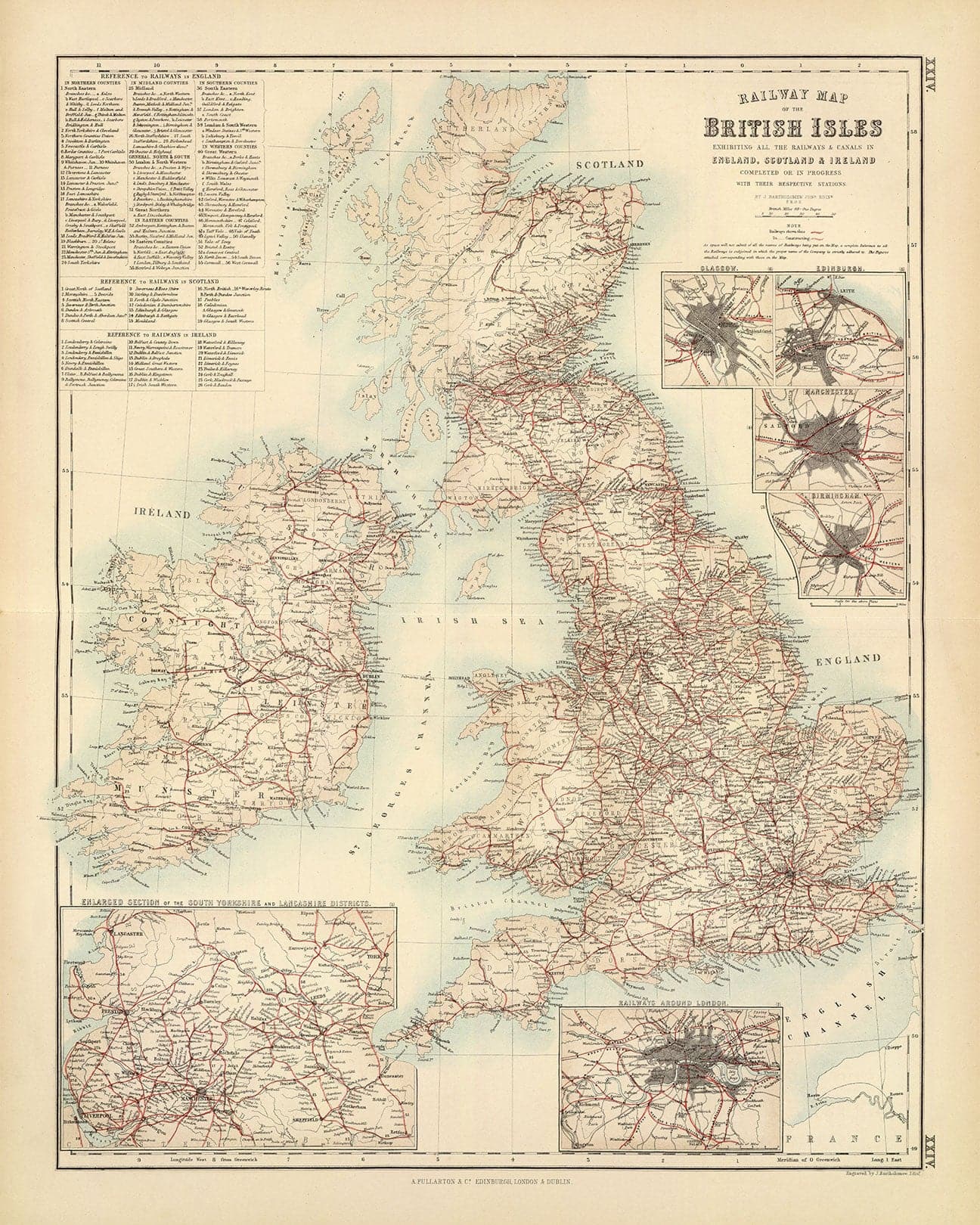 Este es uno de los mapas más bonitos de ferrocarriles en el Reino Unido, casi en el apogeo del sistema ferroviario británico. El mapa muestra todos los ferrocarriles de Inglaterra, Irlanda, Escocia y Gales. Y de manera bastante única, tiene mapas insets que muestran los ferrocarriles detallados de Londres, Manchester, Liverpool, Sheffield, York, Birmingham, Edimburgo y Glasgow.