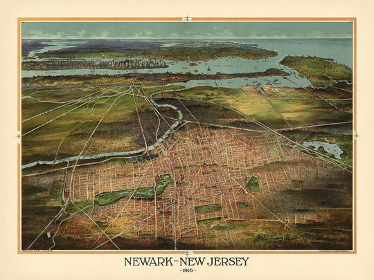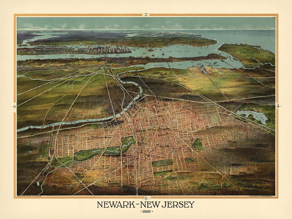 Antigua mapa Birdseye de Newark por Landis, 1916: Manhattan, puerto de Newark, ferrocarriles, bahía de Nueva York
