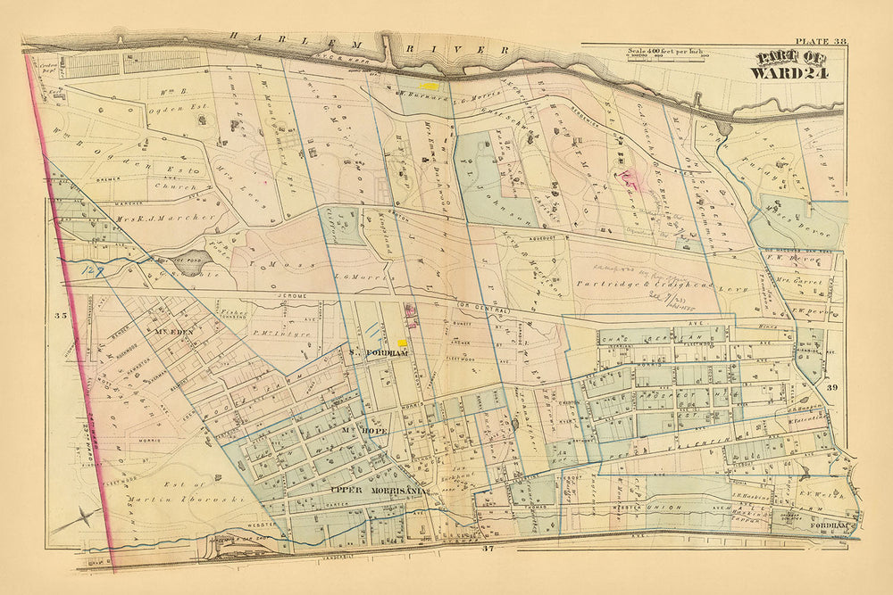 Presentamos la exquisita "Parte del distrito 24, Ciudad de Nueva York," una creación magistral del renombrado cartógrafo G.W. Bromley en 1879. Este mapa litografiado a mano y coloreado ofrece una instantánea meticulosa del Distrito 24 de la Ciudad de Nueva York, ahora parte del Bronx, capturando la esencia del desarrollo urbano durante finales del siglo XIX. La experiencia de Bromley en los detalles es evidente, ya que el mapa muestra no solo el diseño de calles y edificios, sino también la intrincada red de hidrantes, ferrocarriles de vapor y de superficie, y cursos de agua originales. Este mapa es un testimonio del paisaje vibrante y en evolución de la Ciudad de Nueva York, convirtiéndolo en una pieza valiosa para cualquier coleccionista o entusiasta de la historia.