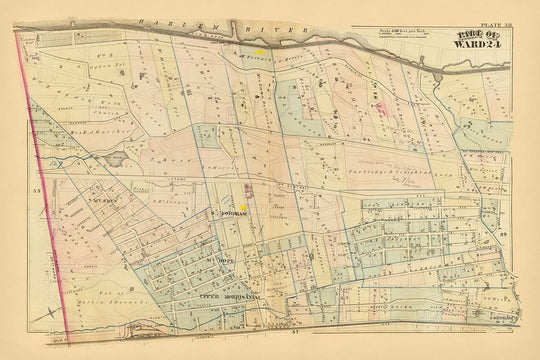 Uno de los hitos notables en este mapa es el río Harlem, que forma el límite norte del Distrito 24. El río, una vía fluvial vital para el comercio y el transporte, se representa en detalle, destacando su importancia para la economía y la infraestructura de la ciudad. El mapa también incluye anotaciones que indican los límites de propiedad y la propiedad, ofreciendo una comprensión más profunda del paisaje socioeconómico de la época. La presencia de tuberías de agua y dimensiones de bloques subraya aún más la utilidad del mapa para la planificación y el desarrollo urbano.