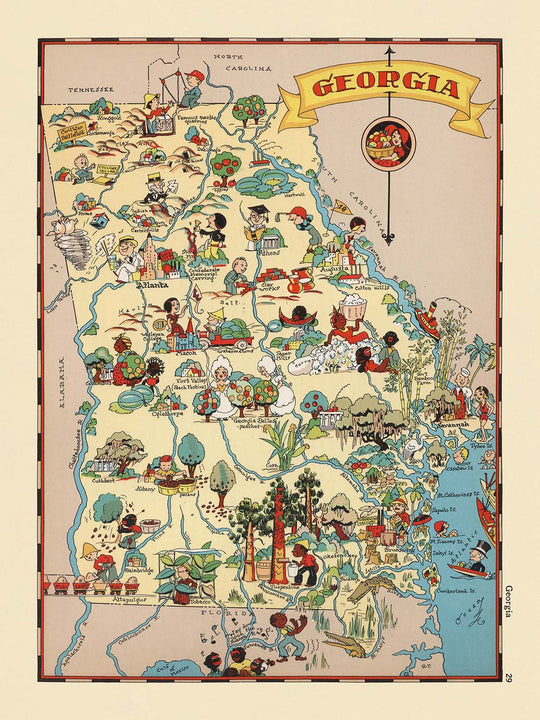 Step into the vibrant world of 1930s Georgia with the exquisitely illustrated map titled simply "Georgia," crafted by the celebrated Ruth Taylor White in 1935. This pictorial masterpiece is far more than a mere geographical record—it is a joyful celebration of the state’s unique character, rendered in a style that is both whimsical and meticulously detailed. Every inch of the map is alive with color and energy, inviting viewers to experience Georgia as it was imagined during a period marked by both hardship and hope. The map’s playful artistry and engaging vignettes evoke a sense of nostalgia, making it a captivating conversation piece for collectors and connoisseurs alike.