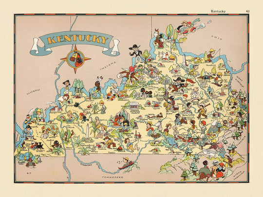 - The map uses vibrant, cartoon-like illustrations to depict stereotypical and notable scenes, people, and activities associated with Kentucky in the 1930s.