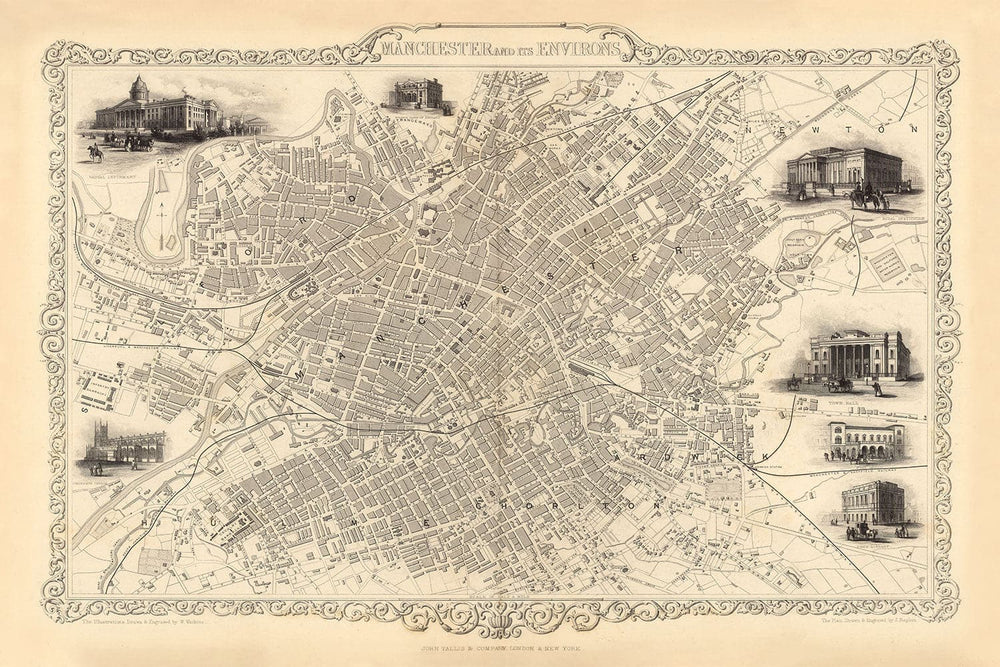 Grabado por John Rapkin y publicado por J. Tallis & Co en 1851, este es uno de los mapas históricos más finos y detallados de Manchester que se pueden encontrar de la época de auge de la Gran Bretaña victoriana.