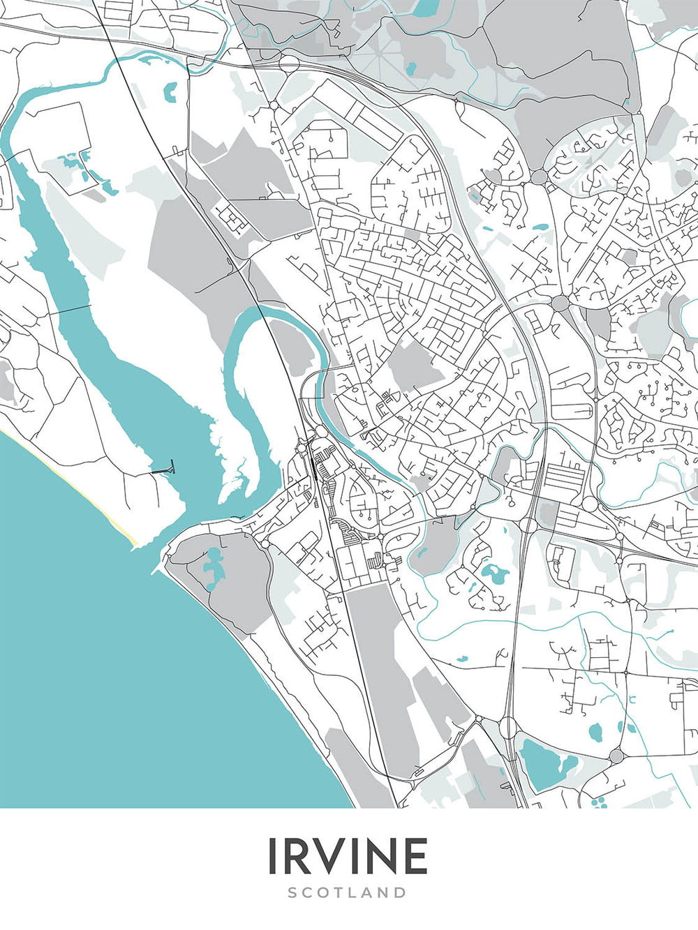 Mapa moderno de la ciudad de Irvine, Escocia: Centro de la ciudad, Río Irvine, Parque Eglinton, A71, Puerto de Irvine