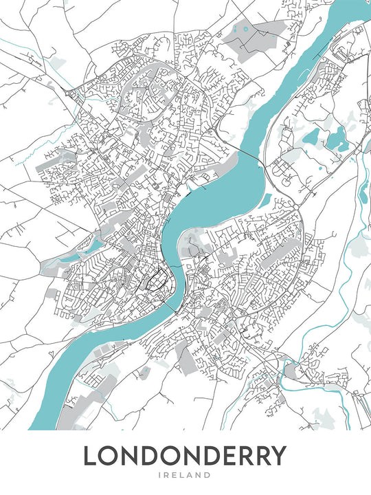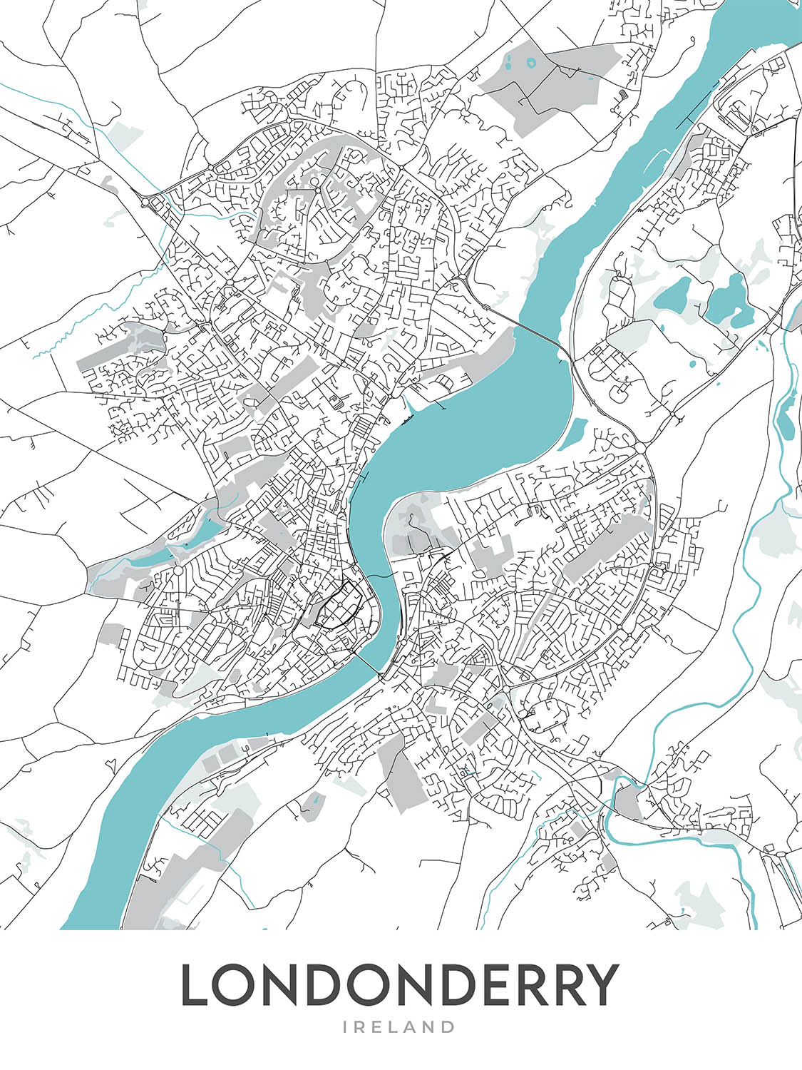 Este mapa de Londonderry, creado por The Unique Maps Co. en 2024, es un mapa moderno y detallado de las calles sin etiquetas. Se centra en la ciudad de Londonderry en la región más amplia de Irlanda del Norte. El mapa cubre un área rectangular que mide 7.18 millas de alto por 6.06 millas de ancho, con el centro del mapa en las coordenadas exactas 55.000516N, -7.313106W. El mapa incluye muchos vecindarios, como Bogside, Brandywell, Creggan, Culmore, Fountain, Galliagh, Iona, Lisnagelvin, Shantallow y Waterside.