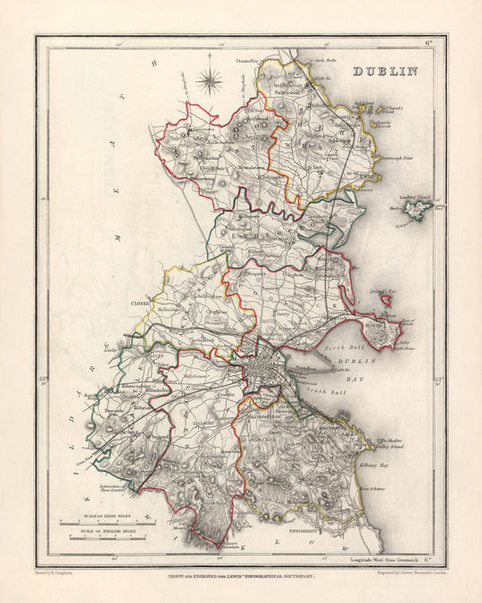 Con la cartografía experta de Samuel Lewis, este mapa presenta una perspectiva única del condado de Dublín a mediados del siglo XIX. Ofrece una instantánea fascinante de los principales pueblos, ciudades y otras características interesantes de la zona, excluyendo la propia Dublín. Tenga en cuenta que es posible que algunas ciudades modernas no aparezcan representadas en este mapa, mientras que otras pueden aparecer con nombres anteriores, lo que añade un interesante elemento de descubrimiento.