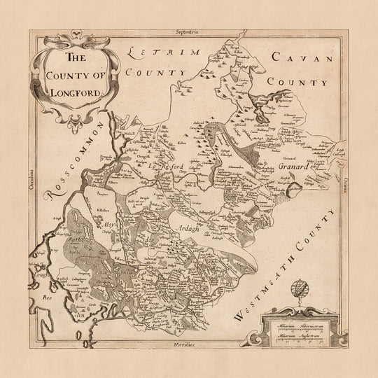 Este mapa del Condado de Longford, publicado originalmente en 1685 por Sir William Petty, es un mapa político y físico detallado que proporciona una gran cantidad de información sobre la región. El mapa se basa en el Down Survey de Irlanda, la primera encuesta de tierras detallada a escala nacional en cualquier parte del mundo. El mapa de Petty es una versión a escala reducida de la encuesta original, pero aún así logra capturar los intrincados detalles del condado, incluyendo carreteras, puentes, ciudades, lugares, obispados y arzobispados. El mapa también incluye representaciones pictóricas de colinas, bosques, ríos, lagos y loughs, lo que lo convierte en un recurso valioso para historiadores y geógrafos por igual.