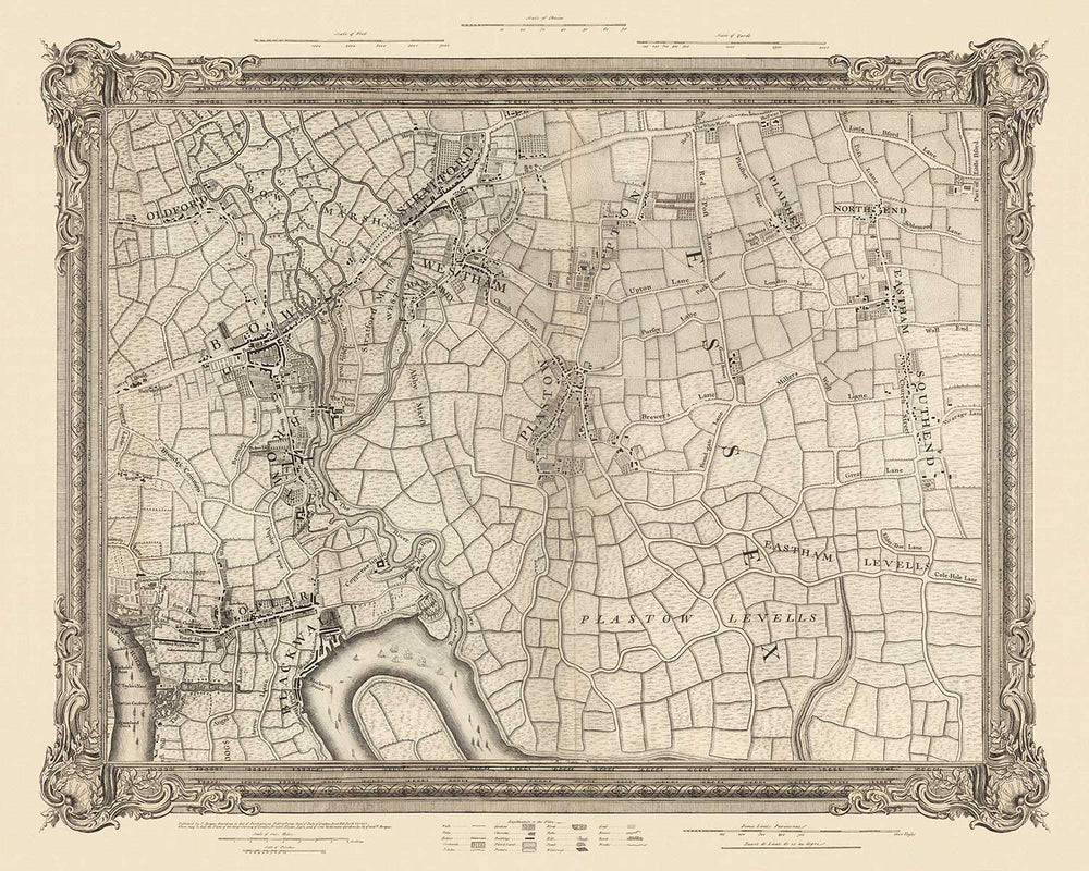 Antiguo mapa del este de Londres en 1746 por John Rocque: Stratford, Eastham, Upton Park, Canary Wharf, Plaistow, E3, E6, E13, E14, E15, E16