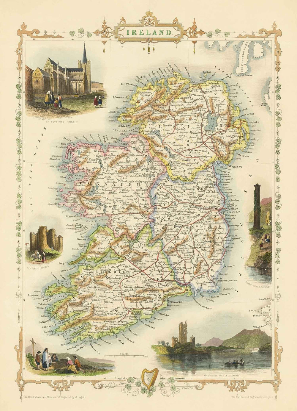 En el mapa hay hermosas e ilustrativas representaciones de varias ciudades y monumentos de Irlanda. Hay una encantadora escena del Lago del Castillo de Ross en Killarney, el Castillo de Limerick, San Patricio en Dublín, la Torre Redonda de Wicklow, y 'El Pozo Sagrado'... pero no estoy seguro de cuál (hay muchos).