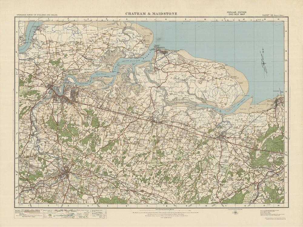 Este mapa antiguo, titulado "Hoja 116 - Chatham & Maidstone", es una pieza cautivadora de la edición "Popular" de una pulgada de Inglaterra y Gales de Ordnance Survey, publicada en 1925. El mapa muestra el condado histórico de Kent, destacando específicamente las ciudades. de Chatham y Maidstone, junto con varios otros lugares fascinantes.
