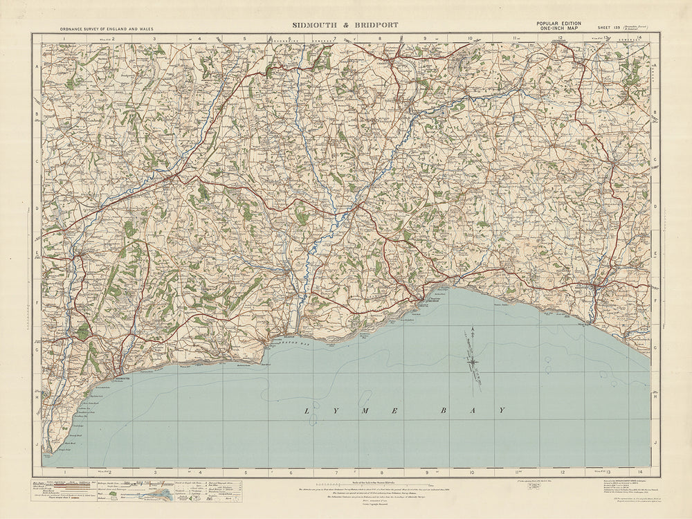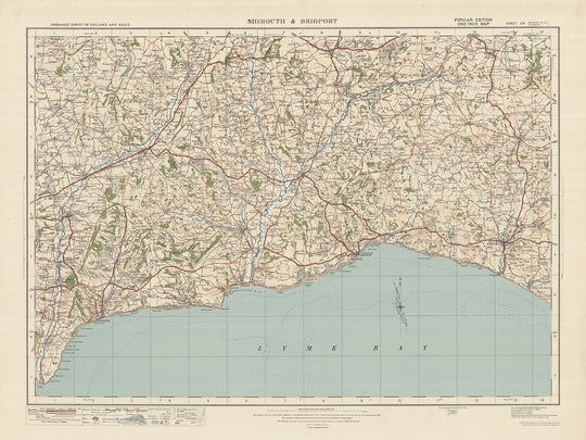 Este mapa antiguo, titulado "Hoja 139 - Sidmouth y Bridport", es una pieza auténtica de la edición "Popular" de una pulgada de Inglaterra y Gales de Ordnance Survey, publicada en 1925. El mapa muestra también las ciudades de Sidmouth y Bridport. como varios otros asentamientos y características notables en el área circundante. Con su cartografía detallada y su significado histórico, este mapa es una pieza fascinante de la historia que sería una adición cautivadora a cualquier pared.