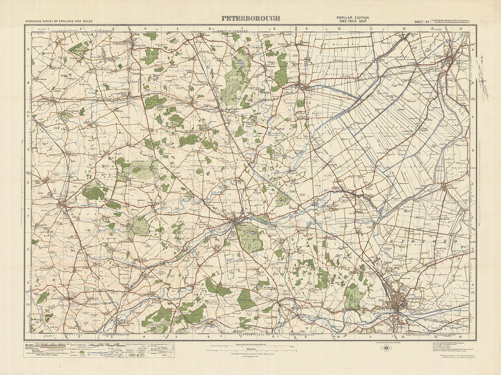 Este mapa meticulosamente detallado, titulado "Hoja 64 - Peterborough", es una pieza fascinante de la edición "Popular" de una pulgada de Ordnance Survey, Inglaterra y Gales, publicada en 1925. El mapa muestra varios pueblos, ciudades y características interesantes, incluido Peterborough. en sí, así como Stamford, Oakley, Bourne, Spalding y la famosa Burghley House.