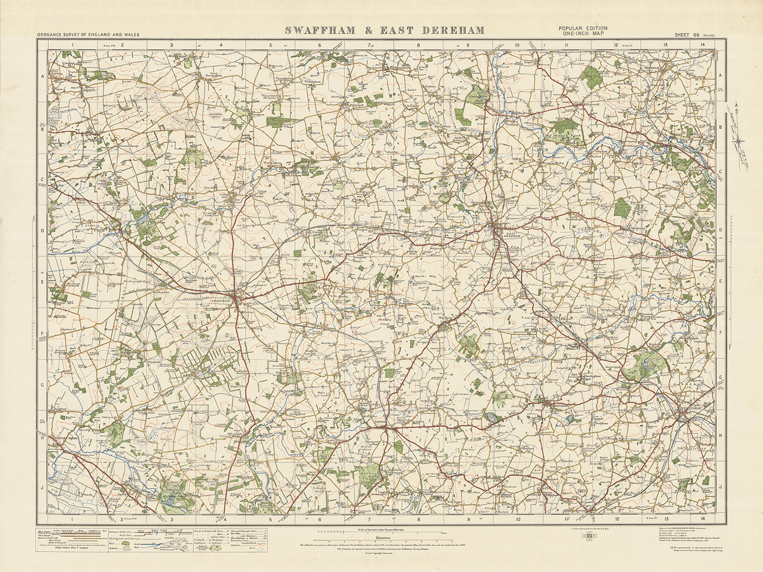 Mapa de Old Ordnance Survey, hoja 66: Swaffam y East Dereham, 1925: Watton, Wymondham, Attleborough, Reepham, Oxburgh Estate