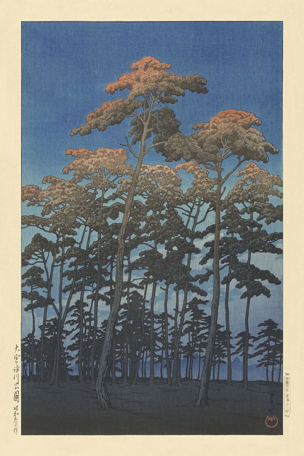 Hasui Kawase es famoso por sus impresionantes paisajes que celebran con belleza las vistas panorámicas de Japón. Sus obras, que produjo más de 600 xilografías durante su vida, se caracterizan por su calidad atmosférica, que evoca una sensación de soledad y reflexión. El parque Hikawa en Omiya no es una excepción, ya que retrata el equilibrio armonioso entre la vida humana y la naturaleza.
