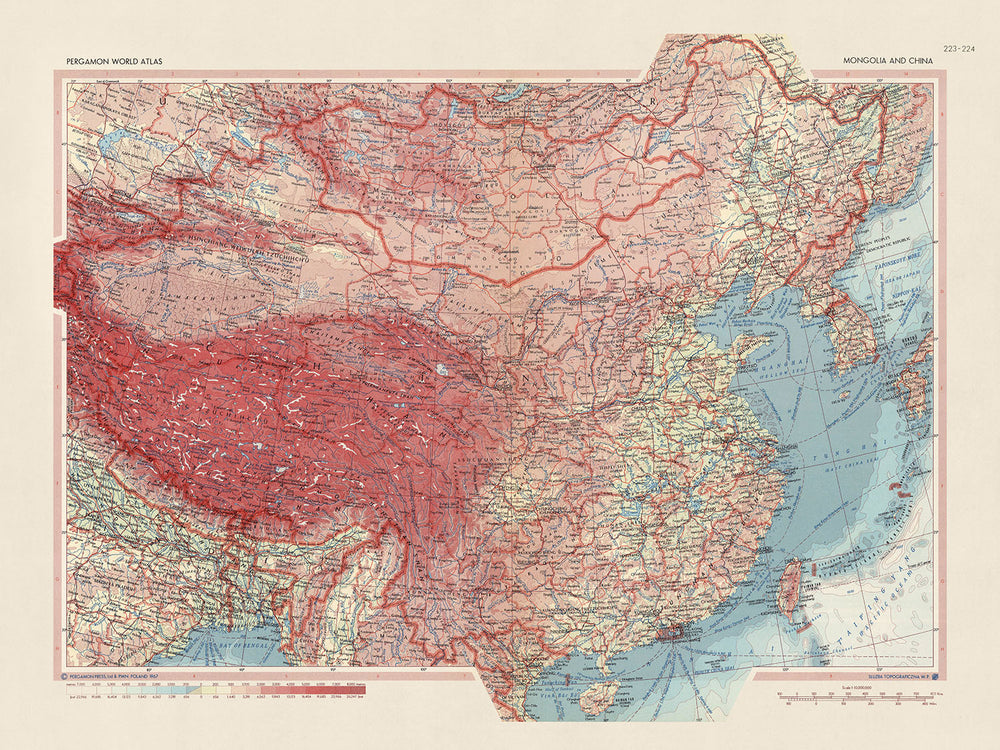 Mapa antiguo de Mongolia y China, 1967: Corea, Taiwán, Atlas político y físico detallado
