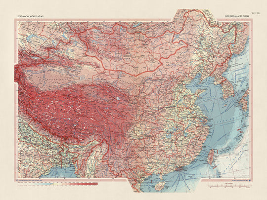 El mapa "Mongolia y China" es un ejemplo notable de mapa político y físico detallado. Ofrece una perspectiva profunda de las complejidades geográficas de estas naciones, proporcionando una gran cantidad de información para el espectador exigente. Las fronteras políticas están claramente delineadas, lo que refleja el panorama geopolítico de la época. De manera similar, las características físicas del paisaje, incluidas las majestuosas cadenas montañosas y las extensas llanuras, se representan con un nivel de detalle impresionante. Esta combinación de mapeo político y físico proporciona una visión integral de la región, lo que la convierte en una pieza interesante e informativa.