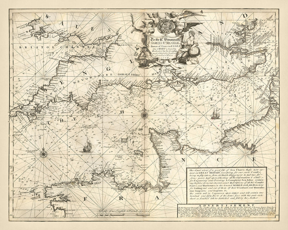 Más allá de su utilidad marítima práctica, la carta está adornada con elementos artísticos que la elevan de una simple carta marítima a una obra de arte. La dedicatoria a Samuel Masham, primer barón Masham, está flanqueada por dos querubines, que encarnan la elegancia y la reverencia de la época. Una rosa de los vientos y líneas de rumbo guían el camino del marinero, mientras que los adornos decorativos y las ilustraciones de características notables como el faro de Eddystone, Goodwin Sands y la Isla de Wight añaden una capa de placer estético y contexto histórico a la carta, convirtiéndola en un preciado posesión para coleccionistas y entusiastas por igual.