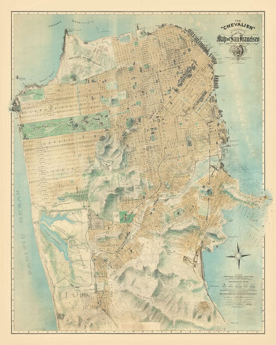 Ríos y parques están elegantemente entrelazados en el diseño del mapa, con el Lago Merced y el Parque Golden Gate sirviendo como puntos focales de belleza natural. Estas características destacan la geografía única de San Francisco y la importancia de los espacios verdes en la planificación urbana. La representación de Chevalier de estas áreas refleja un equilibrio armonioso entre el desarrollo urbano y la naturaleza, una visión que fue innovadora para su tiempo. El mapa invita a los espectadores a apreciar el paisaje de la ciudad en su totalidad, desde las bulliciosas calles hasta las serenas tierras de parque.