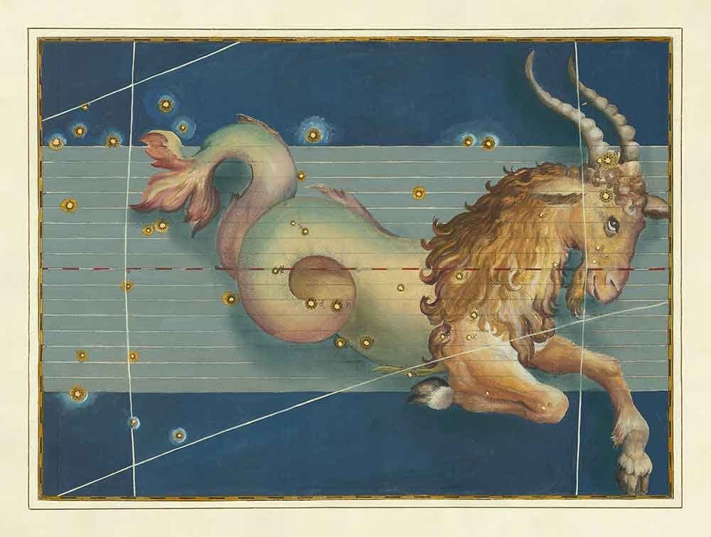 Este mapa estelar fue publicado originalmente en 1603 en "Uranometria" de Johann Bayer, quizás el atlas estelar más influyente jamás publicado y el precursor de todos los atlas estelares modernos. Contenía 51 mapas estelares altamente precisos, 48 de los cuales eran las constelaciones ptolomeicas. Y, por supuesto, los 12 signos principales del Zodiaco, incluyendo este encantador Capricornio, estaban todos incluidos.