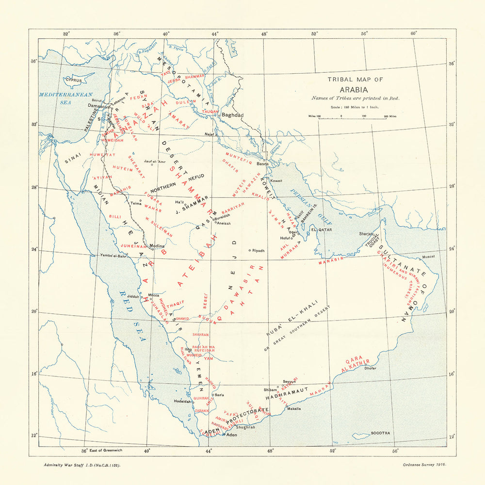 Mapa de las antiguas tribus de Arabia, 1916: Emiratos Árabes Unidos, tribus iraquíes y saudíes, ciudades, revuelta árabe, carta de guerra de la Almirantazgo de la Primera Guerra Mundial