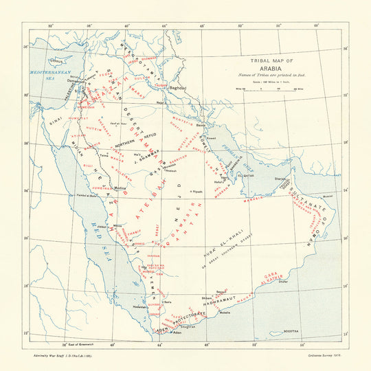 Adéntrese en el rico tapiz de la historia árabe con este exquisito Mapa Tribal de Arabia de 1916, una creación notable del Estado Mayor de Guerra de la Armada. Este mapa temático, elaborado durante la tumultuosa era de la Primera Guerra Mundial, ofrece una representación detallada del paisaje tribal y geográfico de la Península Arábiga. Con las tribus marcadas en un rojo vívido y los lugares en negro clásico, el mapa sirve como un artefacto invaluable, proporcionando una visión de la dinámica sociopolítica de la región al inicio de la Gran Revuelta Árabe. Este mapa no es solo un deleite visual, sino una ventana a un momento crucial en la historia, donde el levantamiento árabe respaldado por los británicos buscaba remodelar el panorama político de Oriente Medio.
