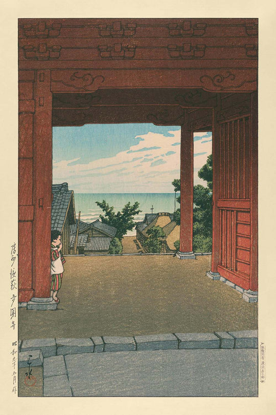 El Templo Tamon en Hamahagi, en Boshu, creado por el estimado Hasui Kawase en 1935, se erige como un testimonio del legado perdurable de este notable artista japonés. Figura prominente en el movimiento Shin-Hanga, Hasui revitalizó la impresión en madera ukiyo-e tradicional al infundirla con influencias estilísticas occidentales. Sus obras son celebradas por capturar la belleza serena y efímera del paisaje japonés.