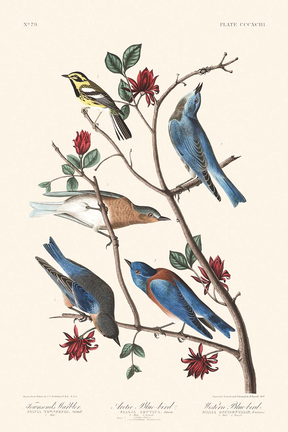El Warbler de Townsend, el Pájaro Azul Ártico, el Pájaro Azul Occidental por John James Audubon, 1827
