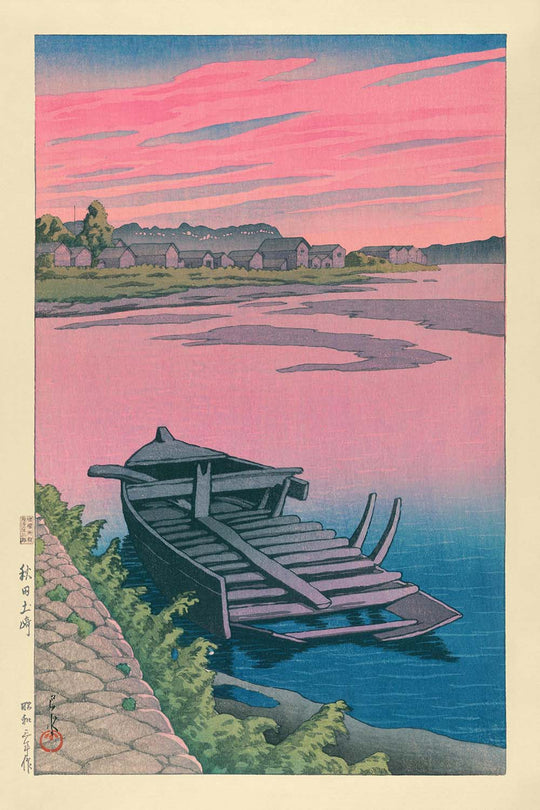 Hasui Kawase ocupa una posición notable en la historia del arte como uno de los artistas más destacados de su época, famoso particularmente por sus evocadoras representaciones de paisajes y atmósferas. Tsuchizaki, Akita ilustra su meticulosa atención al detalle, capturando la tranquila interacción de la tierra, el mar y el cielo que caracteriza su obra. Esta pieza atrae al espectador con su intrincada representación de escenas cotidianas impregnadas de belleza atemporal.