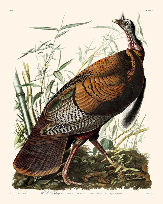 La ilustración de "Wild Turkey" no solo es notable por su representación de la vitalidad y belleza del ave, sino también por su fondo detallado, que refleja el paisaje americano de la época. Siendo una de las aves más interesantes indígenas de los Estados Unidos, esta impresión resalta el plumaje vibrante y la majestuosidad del pavo, convirtiéndola en una pieza impactante para cualquiera que aprecie la vida silvestre y la historia natural.