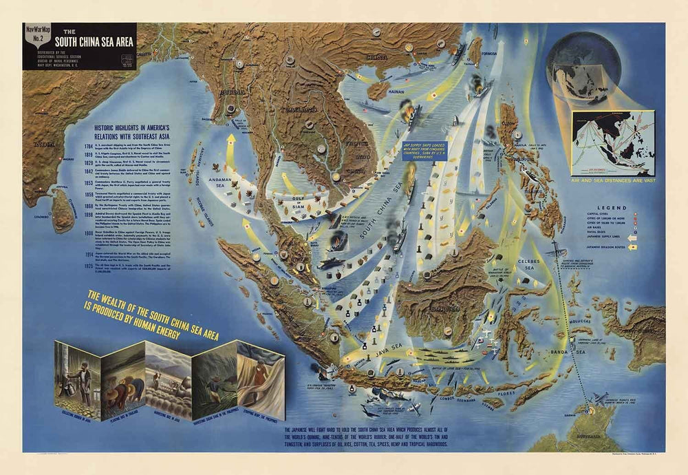 Hay 6 mapas en la serie, cada uno centrado en un aspecto o teatro diferente de la Segunda Guerra Mundial. Este mapa, No. 2, se centra en el Mar de China Meridional y el flujo de las líneas de suministro y las invasiones japonesas.