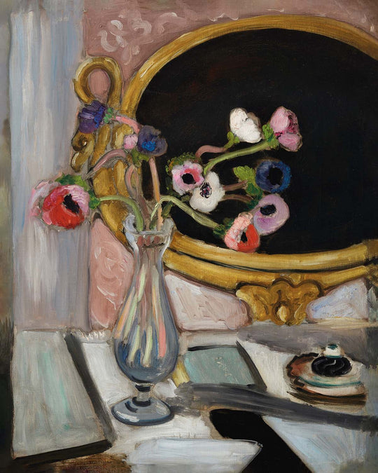 La obra es notable por su exploración del contraste de color y luz, un enfoque que Matisse utilizó para crear profundidad y movimiento dentro de la composición. Las dominantes flores rosas de las anémonas están acentuadas por toques de amarillo, enmarcadas contra el dramático fondo de un espejo negro reflectante. Este uso de un rosa vívido y un negro contrastante genera una tensión energética, atrayendo la mirada del espectador hacia las sutilezas de la pieza. A través de esta impresión, la magistral orquestación del color por parte de Matisse invita al entusiasmo y la vitalidad a cualquier espacio habitable.