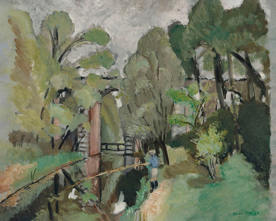 Henri Matisse era conocido por su uso vibrante del color y sus innovadoras técnicas de recorte, que le valieron un estatus legendario entre los artistas de su tiempo. "Le Petit pêcheur, Maintenon" muestra su capacidad para transmitir una escena de tranquila simplicidad con una profunda profundidad. La obra combina bellamente la exploración característica de Matisse de colores audaces y armoniosos, presentando predominantemente verdes suaves, marrones ricos y negros profundos para evocar una conexión íntima con el espectador.