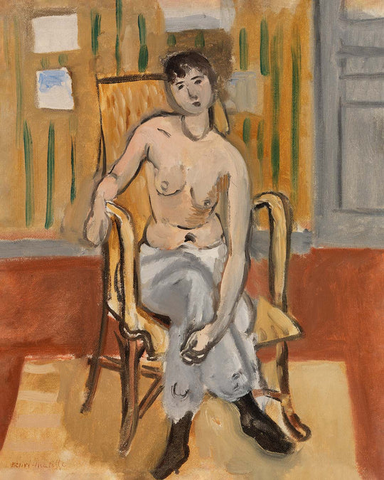 "Nu assis dans une chambre bronzée" (Desnudo sentado en una habitación bronceada) de Henri Matisse, pintado en 1918, es un testimonio de su talento para el color y la forma. Matisse, un líder en el movimiento fauvista, era conocido por su audaz uso del color y su expresivo trazo, que se representa vívidamente en esta cautivadora obra.