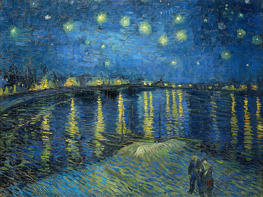 "Noche estrellada sobre el Ródano" muestra el brillante uso del color y la luz por parte de van Gogh. El reflejo de las luces de gas en el agua, la mezcla de tonos azules y amarillos, y el cielo nocturno sereno pero ligeramente turbulento ilustran su excepcional capacidad para transmitir emoción y movimiento. Poseer una impresión de arte fino de esta pintura te permite llevar una pieza de la historia del arte a tu hogar, un iniciador de conversaciones que muestra no solo el genio de van Gogh, sino también tu propio gusto refinado.