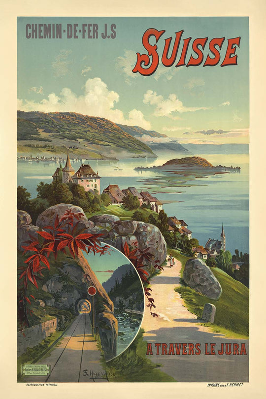 A travers le Jura – Suisse by Frédéric Hugo d’Alési (1895) invites you into the serenity of Switzerland’s Jura region. Commissioned to promote rail travel, the poster opens onto a luminous lakescape: a village of stone houses and a slender church spire nestles against green hills, while a calm, island-dotted lake dissolves into pale blue distance. At the lower left, a striking circular vignette reveals railway tracks plunging through a tunnel in the rock, framed by curling red leaves—an elegant visual promise of swift passage through the mountains. The bold word “Suisse,” in sweeping red letters at the top, anchors the composition with a celebratory flourish.