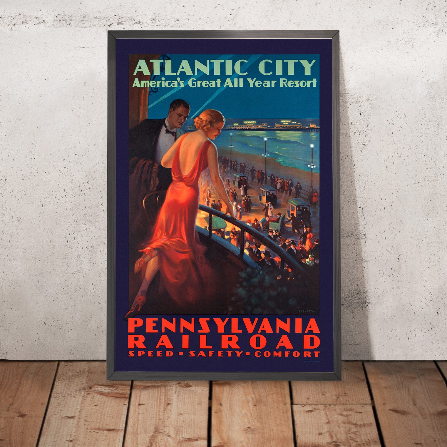 The artwork is notable for how it mythologizes Atlantic City at the height of its boardwalk era. Eggleston turns an evening scene into spectacle: a gentleman in black tie and a woman in a lustrous red gown pause on the balcony while the crowd streams below; spotlights cut diagonally across a turquoise sky; and across the water distant piers sparkle like a necklace of electric lights. The poster proudly carries the railroad’s promise of “SPEED • SAFETY • COMFORT,” a concise summary of what rail travel meant to holidaymakers of the period.