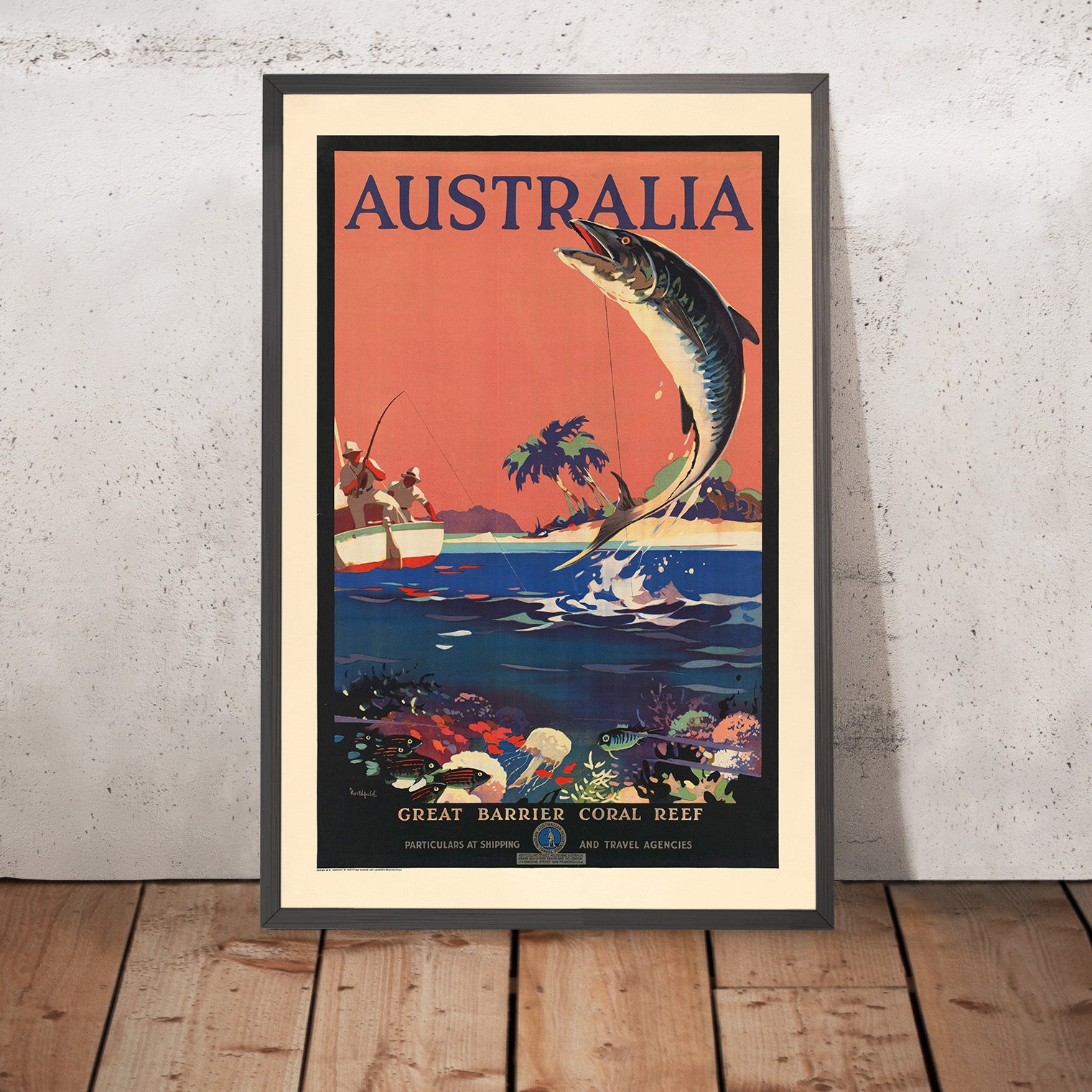 Australia, Great Barrier Coral Reef by James Northfield (1930) is a radiant window into the golden age of Antipodean travel. Created at the height of Australia’s interwar tourism boom, this antique travel poster invited visitors to Queensland’s famed Coral Sea, celebrating the wonder of the Great Barrier Reef with bold Art Deco styling and a sunlit, optimistic mood. The composition revels in marine color—cool ocean blues, lively coral reds, and warm beige tones suggestive of sand and sun—capturing the thrill of tropical discovery that drew travelers from around the world.