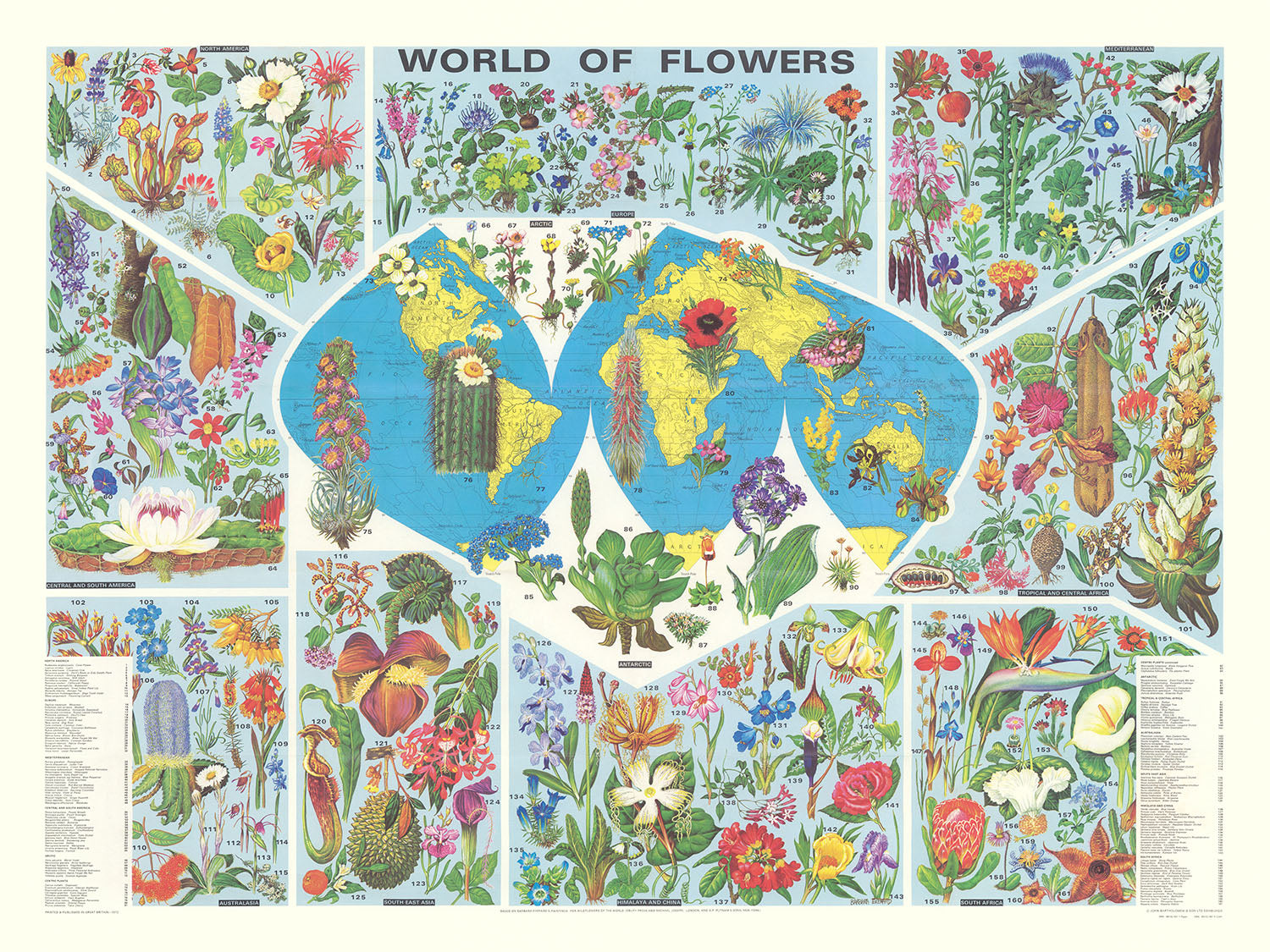 - Incluye un mapa mundial central con paneles circundantes que muestran ilustraciones detalladas de las flores.