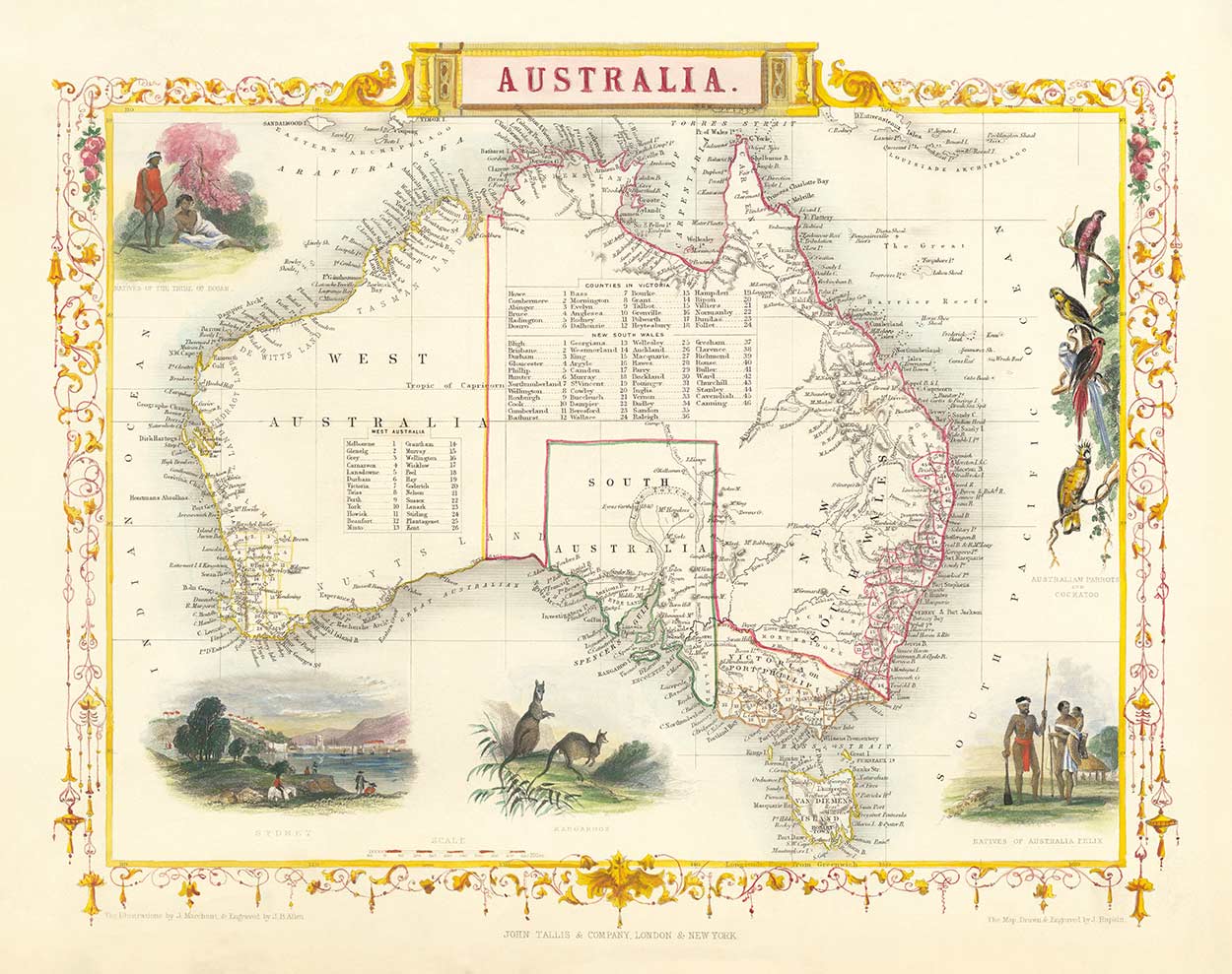 Esparcidas por el mapa hay hermosos y detallados grabados de lugares y vistas notables, como un par de canguros, algunos "nativos de Australia", una vista escénica de Sídney y una colección realmente encantadora de loros.
