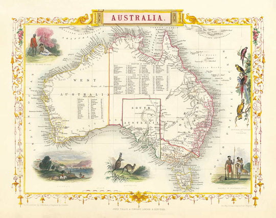 Grabado por John Rapkin y publicado por J. Tallis & Co en 1851, este es uno de los mapas históricos más finos y detallados de Australia, en un momento en que... bueno, mira el mapa: casi ninguna tierra excepto las costas ha sido colonizada. Australia solo había sido fundada aproximadamente 60 años antes - y en caso de que te lo preguntes, 1851 fue el año en que comenzó oficialmente la fiebre del oro!