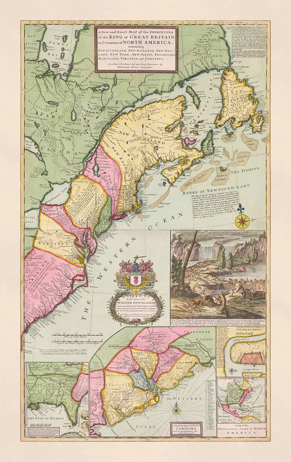 Mapa antiguo de North America 1715 por Herman Moll: Nueva Inglaterra, Nueva Escocia, Nueva York, Carolina, Francés y Trece Colonias británicas