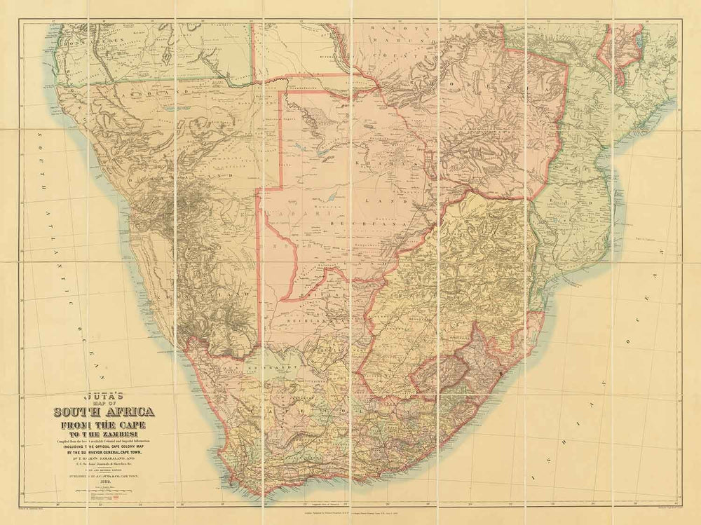 Un mapa increíblemente detallado de África del Sur y Central, publicado originalmente en 1899 por Juta and Company en Sudáfrica y Edward Stanford en Londres.
