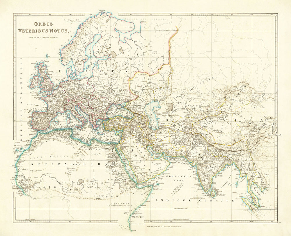 Un mapa precioso del Viejo Mundo, publicado originalmente en 1822 por probablemente el cartógrafo más buscado del mediado del siglo XIX, John Arrowsmith.