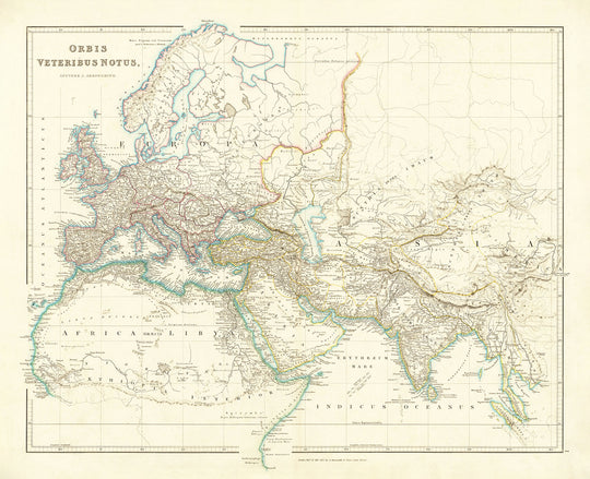 Este mapa, titulado Orbis Veteribus Notus, significa literalmente "El Mundo Conocido por los Antiguos," o quizás el Viejo Mundo. Muestra las partes de Europa, África, Asia y el Medio Oriente que eran conocidas por las civilizaciones antiguas - los romanos, los griegos, los persas, etc.